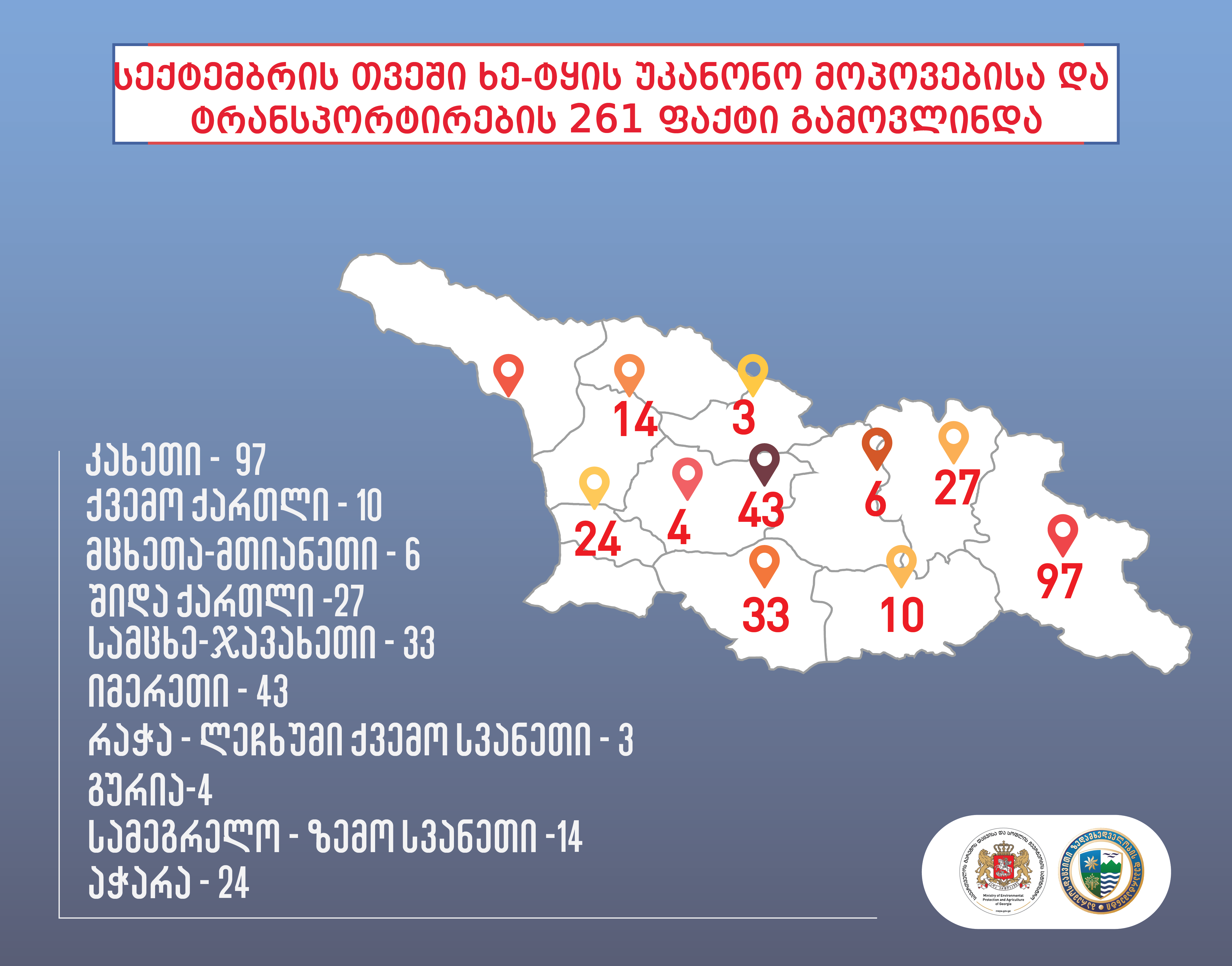 გარემოს დაცვისა და სოფლის მეურნეობის სამინისტროს გარემოსდაცვითი ზედამხედველობის დეპარტამენტის თანამშრომლებმა, 2019 წლის 01 სექტემბრიდან 30 სექტემბრის ჩათვლით, ხე-ტყის უკანონო მოპოვებისა და ტრანსპორტირების 261 ფაქტი გამოავლინეს, მათ შორის 13 ფაქტი სისხლის სამართლის დანაშაულის ნიშნებს შეიცავს.