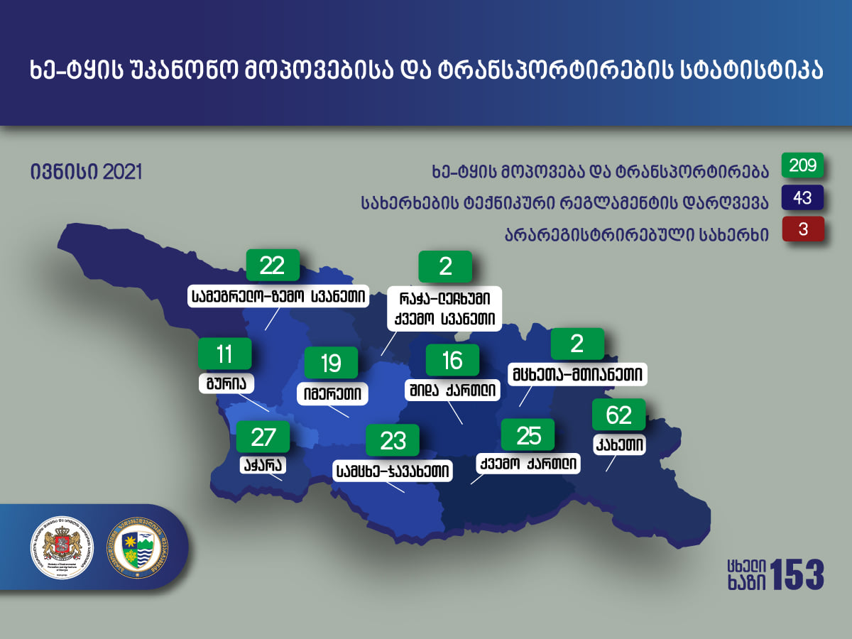გარემოს დაცვისა და სოფლის მეურნეობის სამინისტროს გარემოსდაცვითი ზედამხედველობის დეპარტამენტის თანამშრომლებმა, 2021 წლის 01 ივნისიდან 30 ივნისის ჩათვლით, ხე-ტყის უკანონო მოპოვებისა და ტრანსპორტირების 209 ფაქტი გამოავლინეს, მათ შორის 11 ფაქტი სისხლის სამართლის დანაშაულის ნიშნებს შეიცავს.