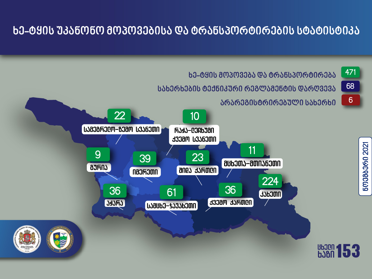 გარემოს დაცვისა და სოფლის მეურნეობის სამინისტროს გარემოსდაცვითი ზედამხედველობის დეპარტამენტის თანამშრომლებმა, 2021 წლის 01 ნოემბრიდან 30 ნოემბრის ჩათვლით, ხე-ტყის უკანონო მოპოვებისა და ტრანსპორტირების 471 ფაქტი გამოავლინეს, მათ შორის 6 ფაქტი სისხლის სამართლის დანაშაულის ნიშნებს შეიცავს.