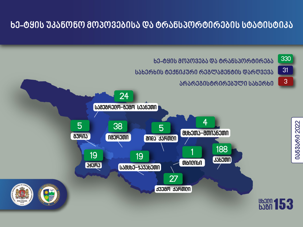 გარემოს დაცვისა და სოფლის მეურნეობის სამინისტროს გარემოსდაცვითი ზედამხედველობის დეპარტამენტის თანამშრომლებმა, 2022 წლის 01 იანვრიდან 31 იანვრის ჩათვლით, ხე-ტყის უკანონო მოპოვებისა და ტრანსპორტირების 330 ფაქტი გამოავლინეს; ამოღებულია უკანონოდ მოპოვებული 563 კუბურ მეტრამდე ხე-ტყე. გამოვლენილი 330 ფაქტიდან 17 სისხლის სამართლის დანაშაულის ნიშნებს შეიცავს.