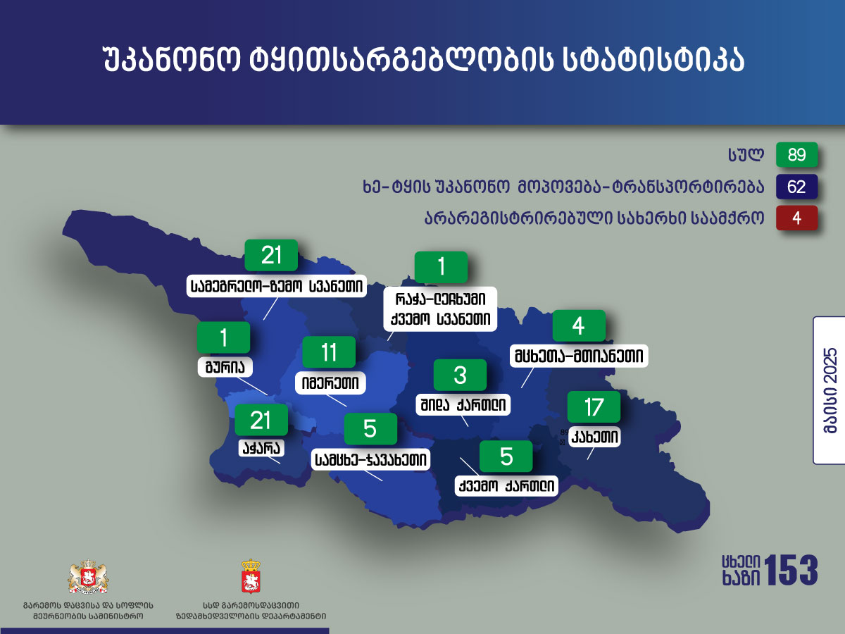 გარემოს დაცვისა და სოფლის მეურნეობის სამინისტროს გარემოსდაცვითი ზედამხედველობის დეპარტამენტის თანამშრომლებმა, უკანონო ტყითსარგებლობასთან ბრძოლის ფარგლებში, 2025 წლის 01 მაისიდან 31 მაისის ჩათვლით, უკანონო ტყითსარგებლობის 89 ფაქტი გამოავლინეს.