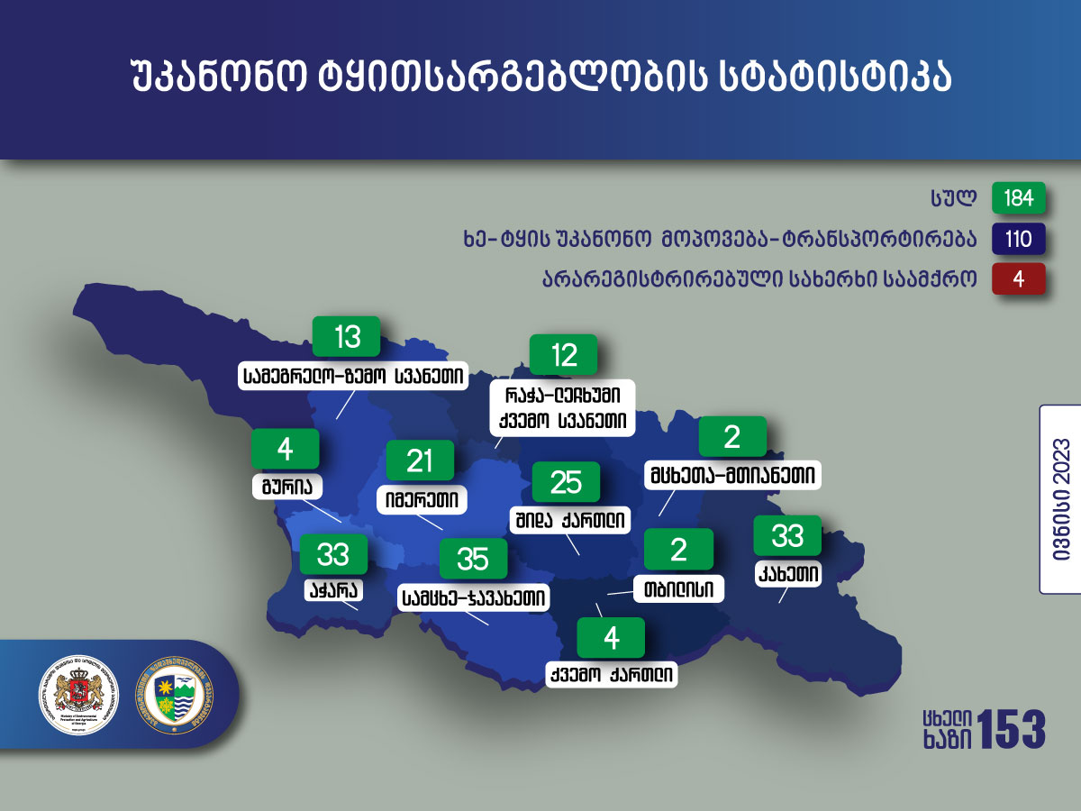 უკანონო ტყითსარგებლობის ყველაზე მეტი - 35 ფაქტი გამოვლენილია სამცხე-ჯავახეთში; 33-33 ფაქტი დაფიქსირდა კახეთსა და აჭარაში, შიდა ქართლში - 25, იმერეთში - 21, სამეგრელო-ზემო სვანეთში - 13, რაჭა-ლეჩხუმი-ქვემო სვანეთში -12, გურიაში - 4, ქვემო ქართლში - 4, მცხეთა-მთიანეთში კი, 2.