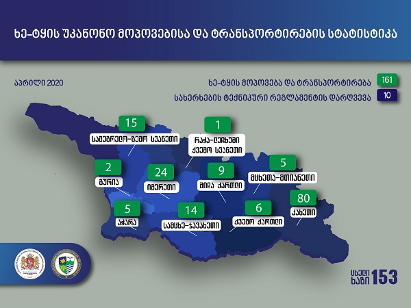 გარემოს დაცვისა და სოფლის მეურნეობის სამინისტროს გარემოსდაცვითი ზედამხედველობის დეპარტამენტის თანამშრომლებმა, 2020 წლის 01 აპრილიდან 30 აპრილის ჩათვლით, ხე-ტყის უკანონო მოპოვებისა და ტრანსპორტირების 161 ფაქტი გამოავლინეს, მათ შორის 3 ფაქტი სისხლის სამართლის დანაშაულის ნიშნებს შეიცავს.